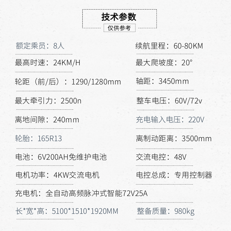 经典外观尽显奢华,续航达 100km,适用于景区、酒店、社区等场景。24 小时售后,提升服务品质与出行格调。